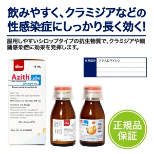 アジスドライシロップは、細菌感染症の治療に用いられるマクロライド系抗生物質です。 クラミジアの第一選択薬であるアジスロマイシンを含有しています。 クラミジアなどの性感染症のほかにも、中耳炎、咽頭炎、気管支炎、肺炎などさまざまな細菌感染症の治療薬として使用されています。 日本のジスロマックのジェネリック医薬品にあたりますが、アジスドライシロップは錠剤ではなく液状タイプです。 感染症や症状により服用する用量が変わります。 【クラミジアの場合】 ・1000mg(25ml)を1週間に1度服用 【喉の痛みなどの場合】 ・500mg(12.5ml)を1日1回服用し、3日間継続服用 【淋菌などの場合】 ・アジスロマイシン注射剤治療後に250mg(6.25ml)を1日1回服用し、5日間継続服用 お薬通販部では、15ml(200mg/5ml)の購入が可能となっています。 ※クラミジア治療の場合、2箱からの購入がおすすめです。