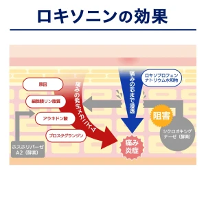 ロキソニンの有効成分であるロキソプロフェンナトリウム水和物には痛み物質の生成を抑える作用があるため、外傷にともなう痛みや関節痛などの改善目的で利用されています。